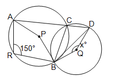 পাশের চিত্রে P ও Q কেন্দ্রবিশিষ্ট বৃত্তদুটি B ও C বিন্দুতে ছেদ করেছে। ACD একটি সরলরেখাংশ। ∠ARB = 150°, ∠BQD = x° হলে, x-এর মান নির্ণয় করি।