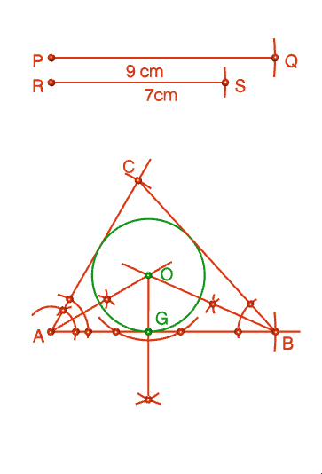 1. একটি সমকোণী ত্রিভুজ অঙ্কন করো,যার সমকোণ সংলগ্ন বাহু দুটির দৈর্ঘ্য যথাক্রমে 7 সেমি ও 9 সেমি। ওই ত্রিভুজের অন্তবৃত্ত অঙ্কন করো। (কেবলমাত্র অঙ্কন চিহ্ন দিতে হবে।)
