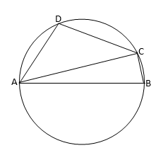 ABCD বৃত্তস্থ চতুৰ্ভুজ, AB বৃত্তের ব্যাস। \(\angle\)ADC=120° হলে, \(\angle\)BAC-এর মান হবে 40°।