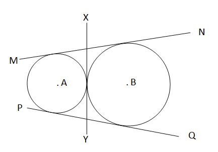 10. দুটি বৃত্ত পরস্পরকে বহিঃস্পর্শ করলে স্পর্শ বিন্দুতে বৃত্ত দুটির সাধারণ স্পর্শক হল সরল সাধারণ স্পর্শক।