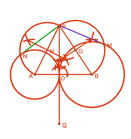 AB একটি সরলরেখাংশের উপর O একটি বিন্দু এবং O বিন্দুতে AB-এর উপর PQ একটি লম্ব অঙ্কন করি। A এবং B বিন্দুকে কেন্দ্র করে যথাক্রমে AO এবং BO দৈর্ঘ্যের ব্যাসার্ধ নিয়ে দুটি বৃত্ত অঙ্কন করি এবং এই বৃত্তদুটির সাপেক্ষে PQ-কে কী বলা হয় লিখি। P বিন্দু থেকে বৃত্ত দুটির অপর স্পর্শক দুটি অঙ্কন করি।