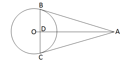 প্রদত্ত : O কেন্দ্রীয় বৃত্তের বহিঃস্থ বিন্দু A থেকে বৃত্তে দুটি স্পর্শক টানা হয়েছে যারা বৃত্তকে যথাক্রমে B ও C বিন্দুতে স্পর্শ করেছে । A, O যুক্ত করা হল । AO, BC কে D বিন্দুতে ছেদ করেছে ।