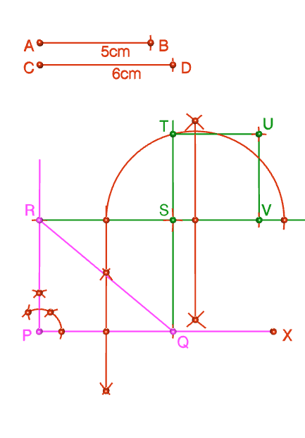 26. একটি সমকোণী ত্রিভুজ যার সমকোণ সংলগ্ন বাহুদুটির দৈর্ঘ্য 4 সেমি. ও ৪ সেমি.।- ত্রিভূজটি অঙ্কন করি ও ত্রিভুজটির পরিবৃত্ত অঙ্কন করে পরিকেন্দ্রের অবস্থান লিখি ও পরিব্যাসার্ধের [অর্থাৎ পরিবৃত্তের ব্যাসার্ধের দৈর্ঘ্য] দৈর্ঘ্য মেপে লিখি। [কেবলমাত্র অঙ্কন চিহ্ন দিই]