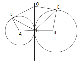 A ও B কেন্দ্রীয় দুটি বৃত্ত অঙ্কন করেছি যারা পরস্পরকে C বিন্দুতে বহিঃস্পর্শ করেছে। C বিন্দুতে অঙ্কিত স্পর্শকের উপর O একটি বিন্দু এবং OD ও OE যথাক্রমে A ও B কেন্দ্রীয় বৃত্তকে যথাক্রমে D ও E বিন্দুতে স্পর্শ করেছে । ∠COD = 56°, ∠COE = 40°, ∠ACD = x° এবং ∠BCE = y° হলে প্রমাণ করি যে OD = OC = OE এবং x-y = ৪