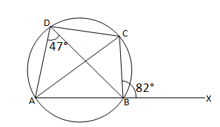 ABCD বৃত্তস্থ চতুর্ভুজের AB বাহুকে X বিন্দু পর্যন্ত বর্ধিত করলাম এবং মেপে দেখছি ∠XBC = 82° এবং ∠ADB = 47°; ∠BAC-এর মান হিসাব করে লিখি।