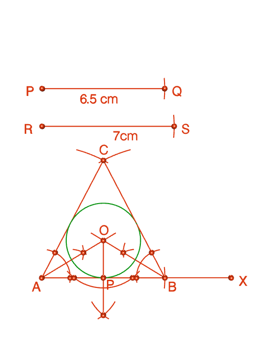 1. একটি সমদ্বিবাহু ত্রিভুজ অঙ্কন করো যার ভূমির দৈর্ঘ্য 7.8 সেমি এবং সমান বাহু দুটির প্রত্যেকটির দৈর্ঘ্য 6.5 সেমি। ওই ত্রিভুজের একটি অন্তবৃত্ত অঙ্কন করো।