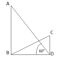 D বিন্দু থেকে প্রথমটির চূড়া A বিন্দুর উন্নতি কোণ ∠ADB=60° আমাদের নির্ণয় করতে হবে,প্রথমটির গোড়া B বিন্দু থেকে দ্বিতীয়টির C বিন্দুর উন্নতি কোণ ∠CBD এর মান । ধরি,∠CBD=θ;