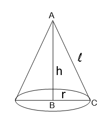 চিত্রের লম্ব বৃত্তাকার শঙ্কুর ভূমির ব্যাসার্ধ, উচ্চতা এবং তির্যক উচ্চতা সমকোণী ত্রিভূজ \(\triangle\)ABC এর বাহুত্রয় ।