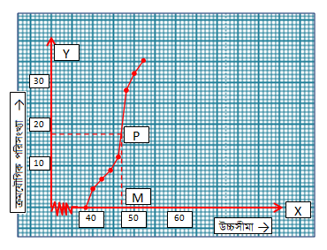 প্রদত্ত তথ্যের ক্রমযৌগিক পরিসংখ্যা (ক্ষুদ্রতর সূচক) তালিকা তৈরি করে ছক কাগজে ওজাইভ অঙ্কন করি এবং লেখচিত্র থেকে মধ্যমা নির্ণয় করি। সূত্রের সাহায্যে মধ্যমা নির্ণয় করে যাচাই করি।