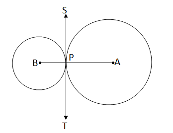 ধরি, ST হলো সাধারণ স্পর্শক যা দুটি বৃত্তকেই P বিন্দুতে স্পর্শ করেছে ।