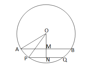 ধরি, O কেন্দ্রীয় বৃত্তটির দুটি জ্যা AB এবং PQ -এর দৈর্ঘ্যের অনুপাত AB:PQ=4:3। এবং জ্যা দুটির কেন্দ্র থেকে দূরত্ব OM=9 সেমি এবং ON=12 সেমি । ধরি, AB\(=4x\) সেমি এবং PQ\(=3x\) সেমি ।