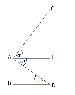 যদি একটি 18 মিটার উঁচু পাঁচতলা বাড়ির ছাদ থেকে দেখলে একটি মনুমেন্টের চুড়ার উন্নতি কোণ 45° এবং মনুমেন্টের পাদদেশের অবনতি কোণ 60° হয়, তাহলে মনুমেন্টের উচ্চতা নির্ণয় করো। (√3=1.732)